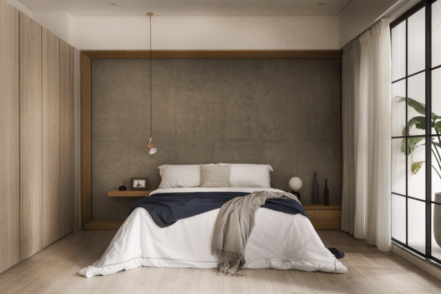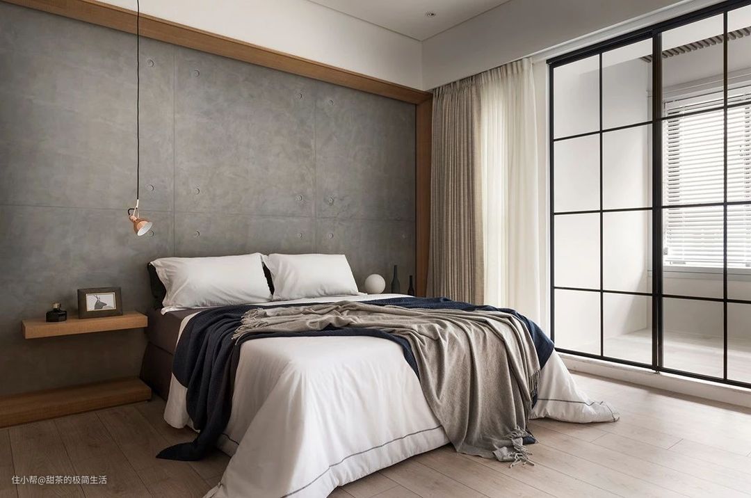 卧室的背景墙选择了中灰色的砾土涂料,降低了整个空间的明度,较暗的环境可以让屋主的睡眠状态更加放松。
