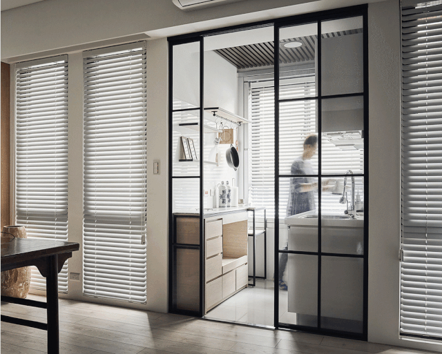 厨房与客厅相邻,面积不大,做了“双一字型”结构,收纳空间充足且动线合理。因为厨房靠近窗户,所以采光很好,设计师做了黑框玻璃式厨房推拉门,既能将窗外的自然光引入客厅,也能阻隔油烟飘进室内。