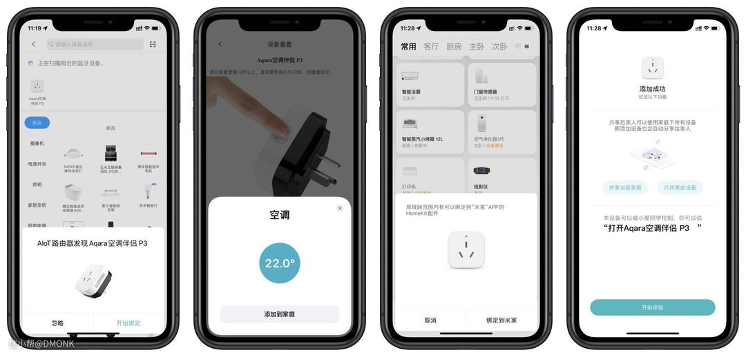 Aqara空调伴侣P3的配置还是非常简单的,首先打开米家App,如果你用的小米带AIoT天线的路由器即可自动发现设备,然后根据提示一步步的添加到苹果的家庭和米家App即可。