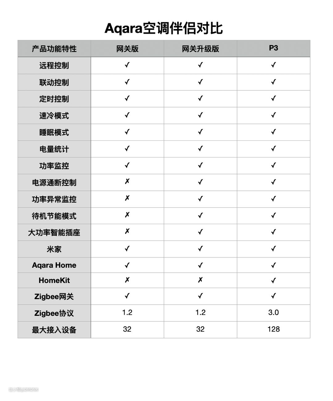 可以看到空调伴侣P3是目前功能最完善的型号,除了支持远程控制、智能联动、睡眠模式、电量统计、电源通断控制等常规功能以外,还升级了Zigbee 3.0网关功能,最大可接入128个Aqara的智能子设备,且通过了Homekit认证,成为国内首款接入Homekit空调智能控制器产品,可以通过Siri语音和HomeKit自动化控制。