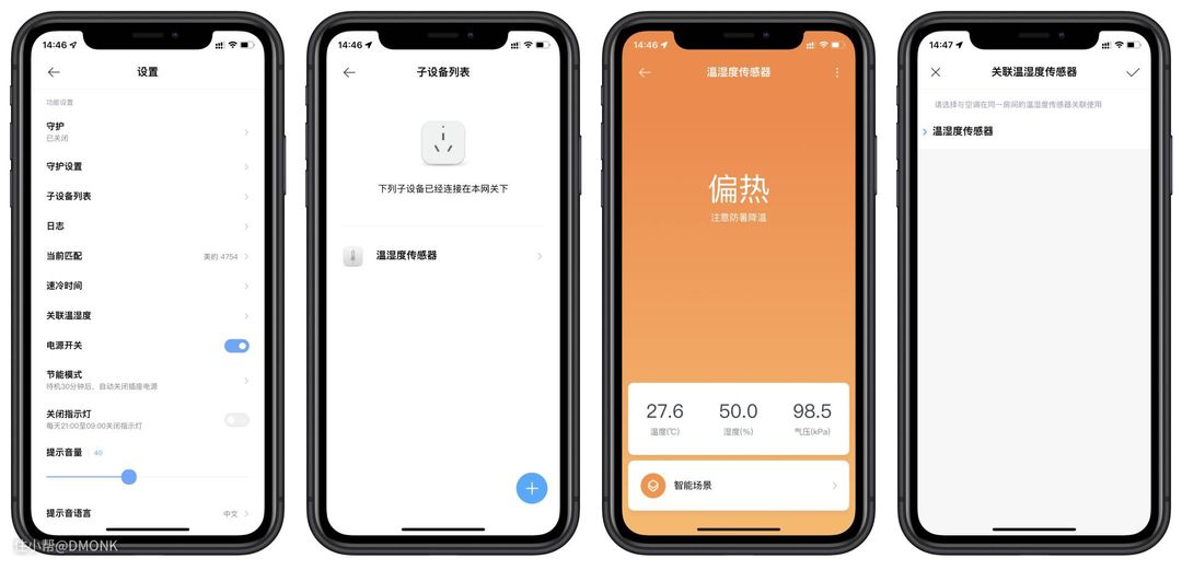 空调伴侣自带温湿度传感器,因为出厂已经匹配好,也无需额外设置就可以使用。
