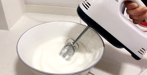 ③ 打发蛋清,70g细砂糖分三次加入到蛋清中,分别是粗泡、细泡、出现纹路的时候加。用电动打蛋器打发至能竖起直角尖即可。