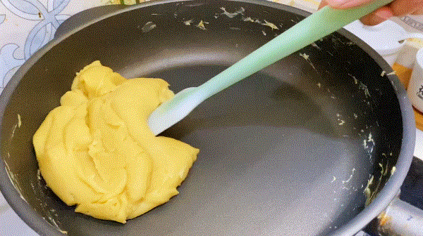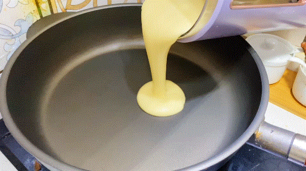 ⑤ 打好的绿豆糊倒入平底锅中,加入一半玉米油,中小火炒至吸收后,再加入另一半玉米油接着炒。