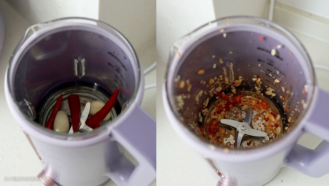 ④ 接下来制作灵魂蘸料,再次请出大宇万能的破壁机,楼主真是每天都会用到,非常实用。把大蒜、小米辣扔进破壁机搅打成沫。