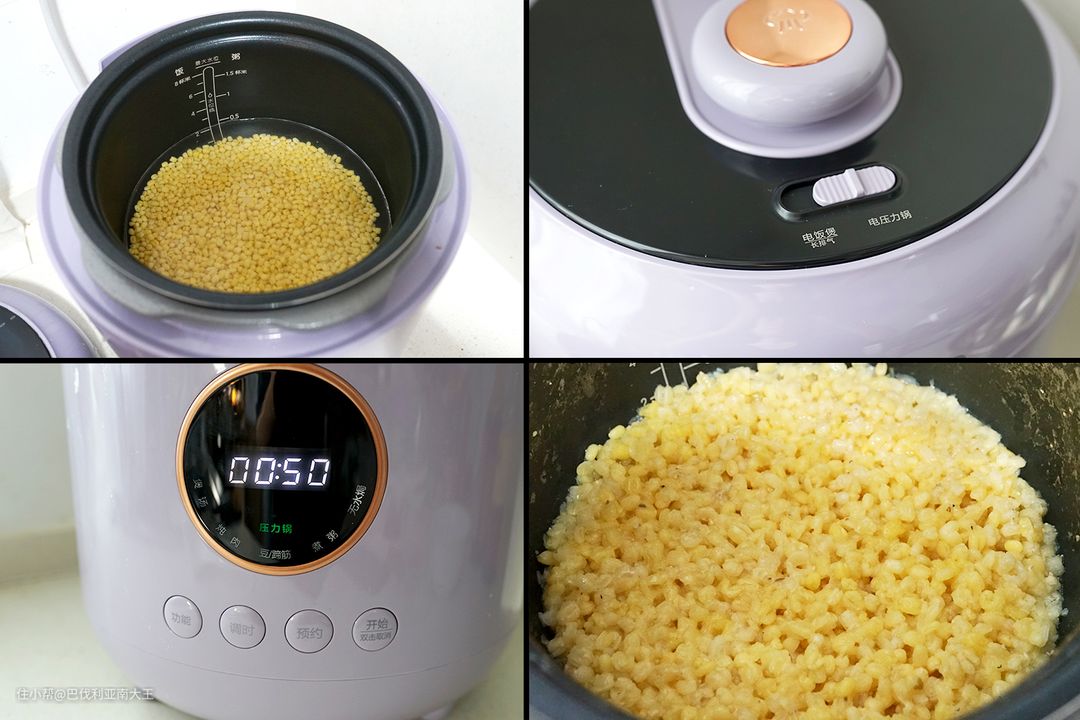 ① 脱皮绿豆洗净后,倒入大宇二合一饭煲电压力锅中,加入500g清水。
