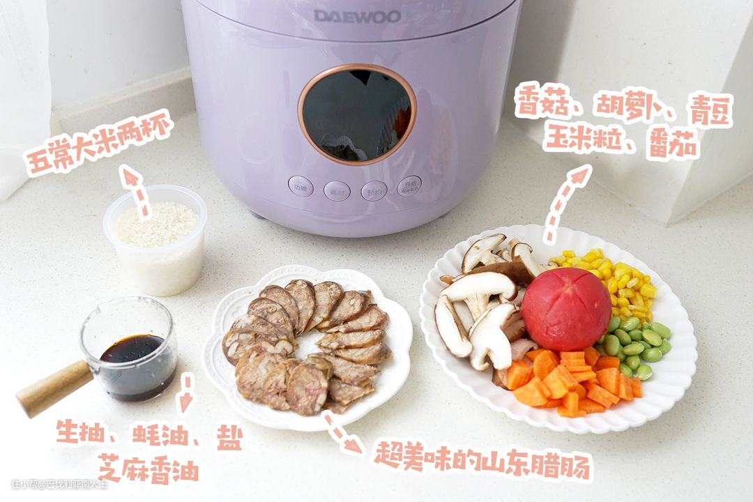 所需食材:大米、腊肠、香菇、胡萝卜、青豆、玉米粒、番茄、蚝油、生抽、盐、芝麻香油