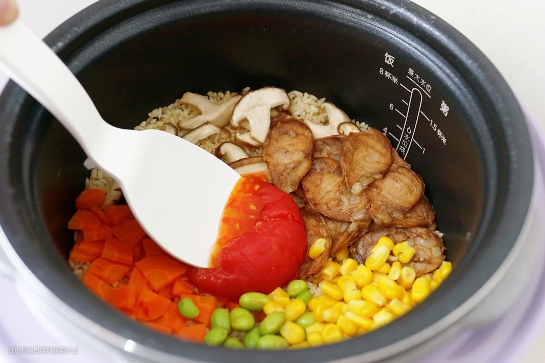 ② 把配菜们铺到大米上面,西红柿放在最中间,选择电饭煲模式下的精华饭程序,55分钟。