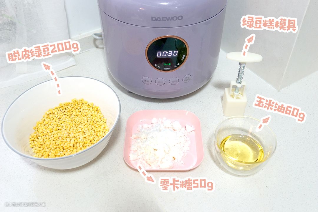 所需食材:脱皮绿豆200g、水500g、玉米油60g、零卡糖50g、绿豆糕模具