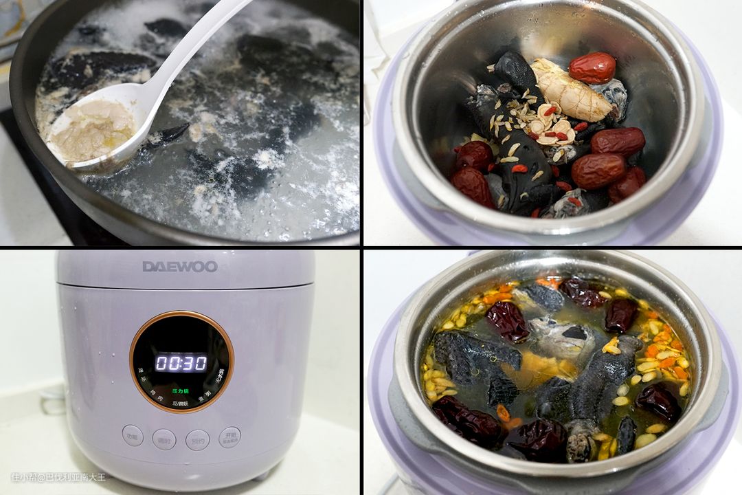 ② 捞出乌鸡装入压力锅中,依次放入生姜、石斛、西洋参、大枣。石斛可以滋阴补虚、益气生津,平时也可以冲开水泡着喝,西洋参可以补气养阴,清热生津,都是对身体非常好的补品。