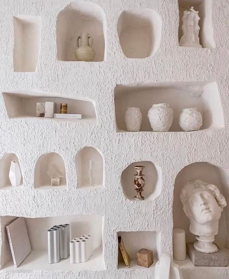 日常生活中的装饰摆件、工艺品、陶瓷器皿置于壁龛之中,就成了一道独特的展示墙。或者搁置一些日常用品、收纳箱、台灯、书本等,能够使物品归纳有序,方便顺手取放。