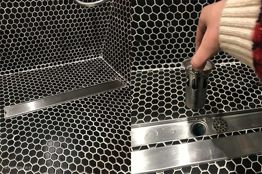 隐形地漏安装前会在下水道位置会做一个凹面,然后盖上整体的盖板,盖板与瓷砖之间留有缝隙,可以保证排水顺畅,整体也更加美观。