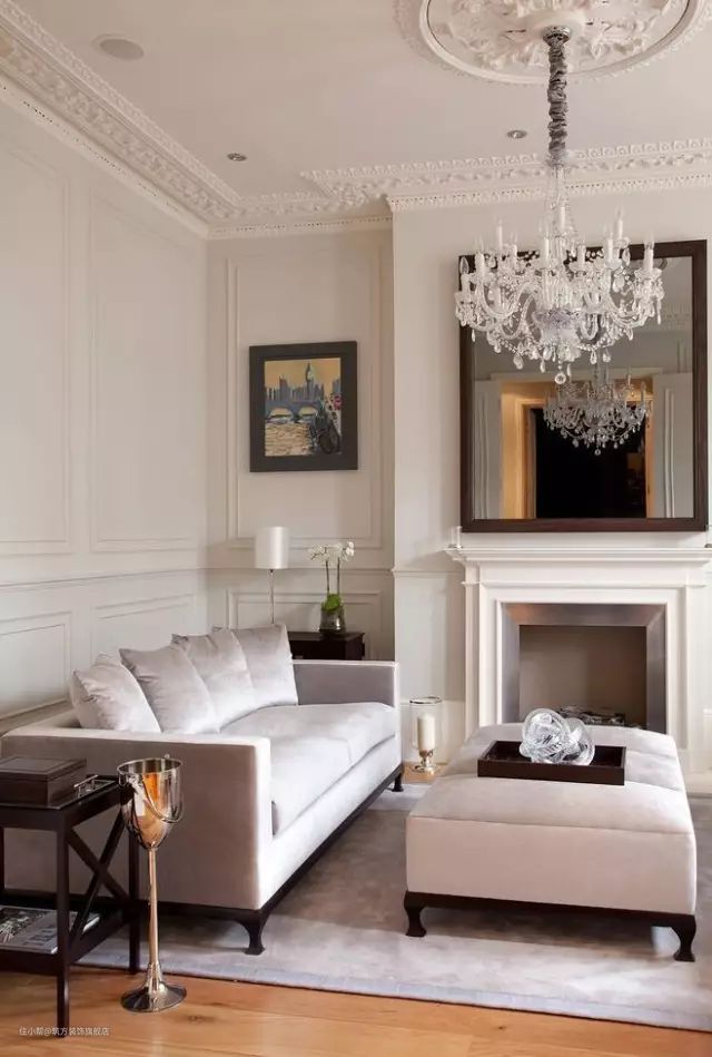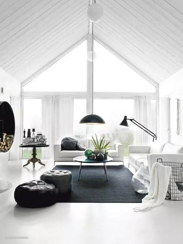 ▼白色的墙面、白色的沙发可以选择深灰色的地毯来过渡,搭配黑色的沙发凳,视觉效果非常自然舒适。