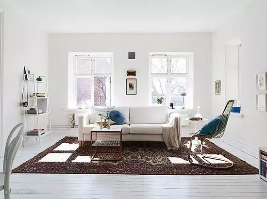 ▼白色空间可以选择的颜色很有多样性,可以选择褐色花纹地毯来过渡,和木茶几搭配一起也非常自然,突出空间层次感。
