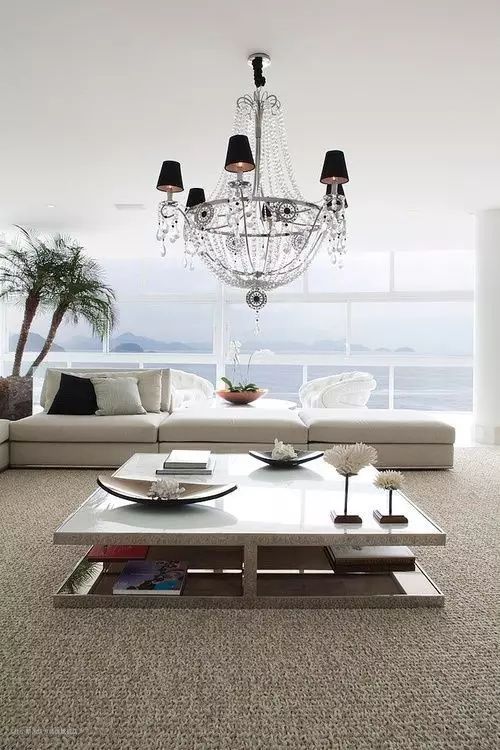 ▼黑色沙发和白色茶几的空间,可以利用灰色的地毯来过渡,增加空间的层次感。