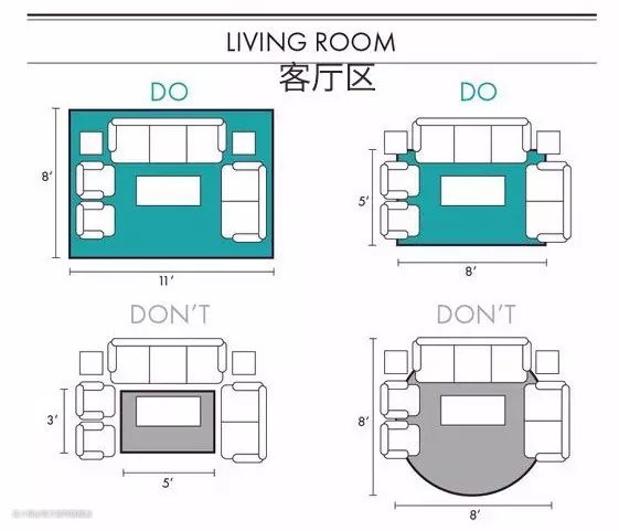 下面这张图就能让你一秒懂得地毯正确摆放位置和错误位置。