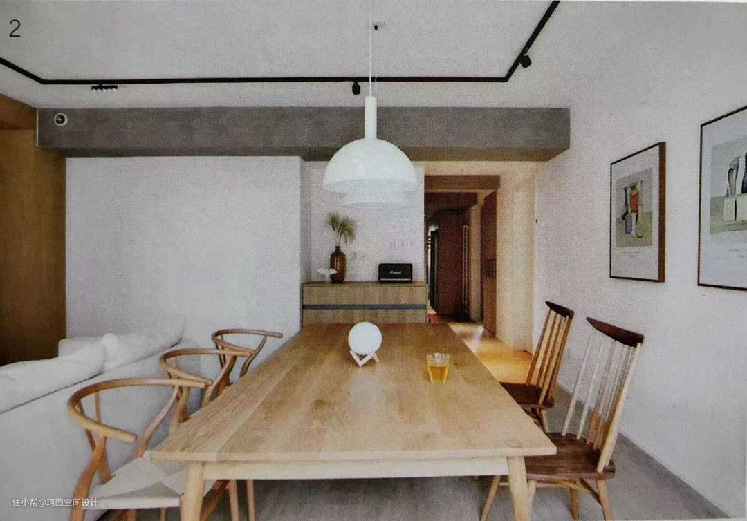 - 改造后,客餐厅一体,3m长的白色布艺沙发隐性界定出客厅和用餐区,整面书墙是公共空间的点睛之笔,柜体采用“藏二露八”的设计理念,既可用来放书,也能展示屋主的藏品,来丰富的视觉感受。