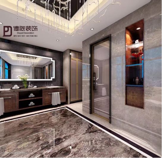 以木、石为主材的主卫,加入风格十足的吊灯,整体既稳重大气又精致华丽