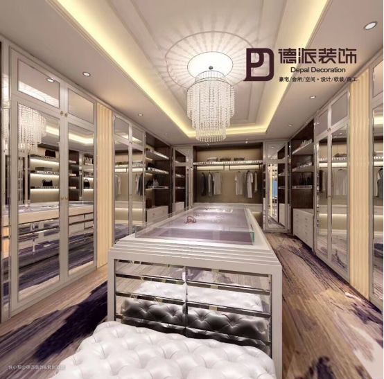 衣帽间多采用开放式衣橱,镜面衣橱,在光亮的折射下,打造出光影重叠,将空间照亮的富丽堂皇