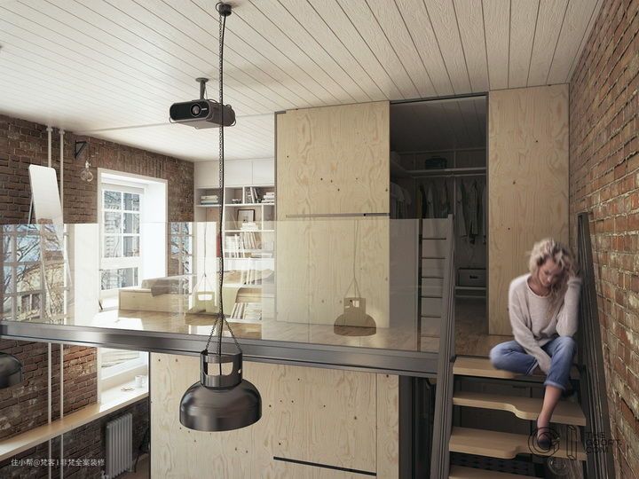 这座公寓位于乌克兰首都基辅,之前是印刷厂的办公室,这样一栋拥有悠久历史的建筑,被改造后,成为了一对年轻夫妇的复式公寓。公寓面积约为35.7平米,高度约为4米。为了增加可用空间,同时又不会显得压抑,设计师在空间一角建造出一个LOFT形式的卧室,整面的收纳墙,配上简单的铁架楼梯,同时用投影仪取代电视,餐客一体的多功能区域,使原本不大的空间显得更加宽敞舒适。