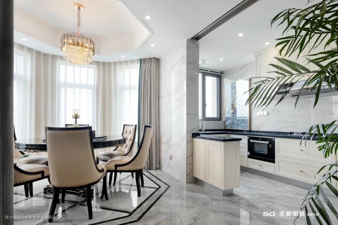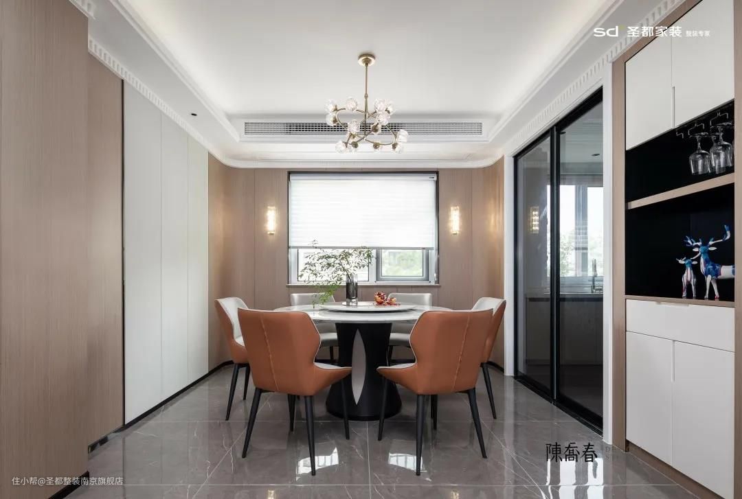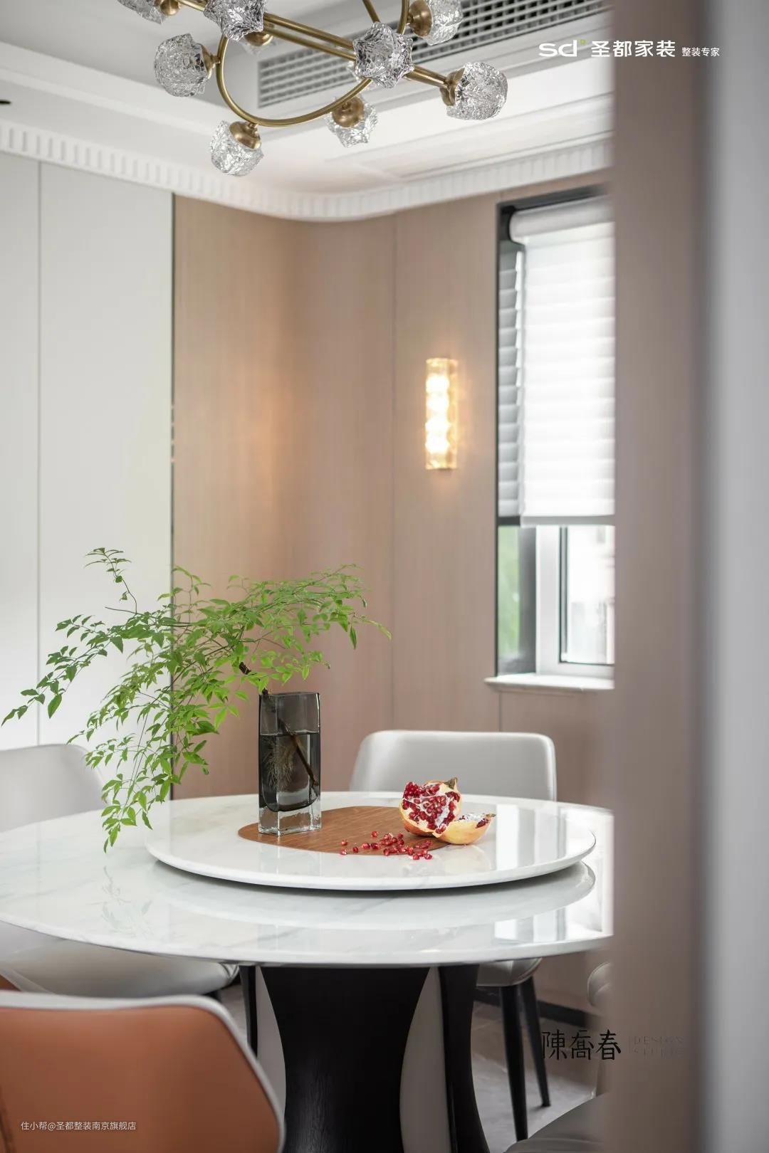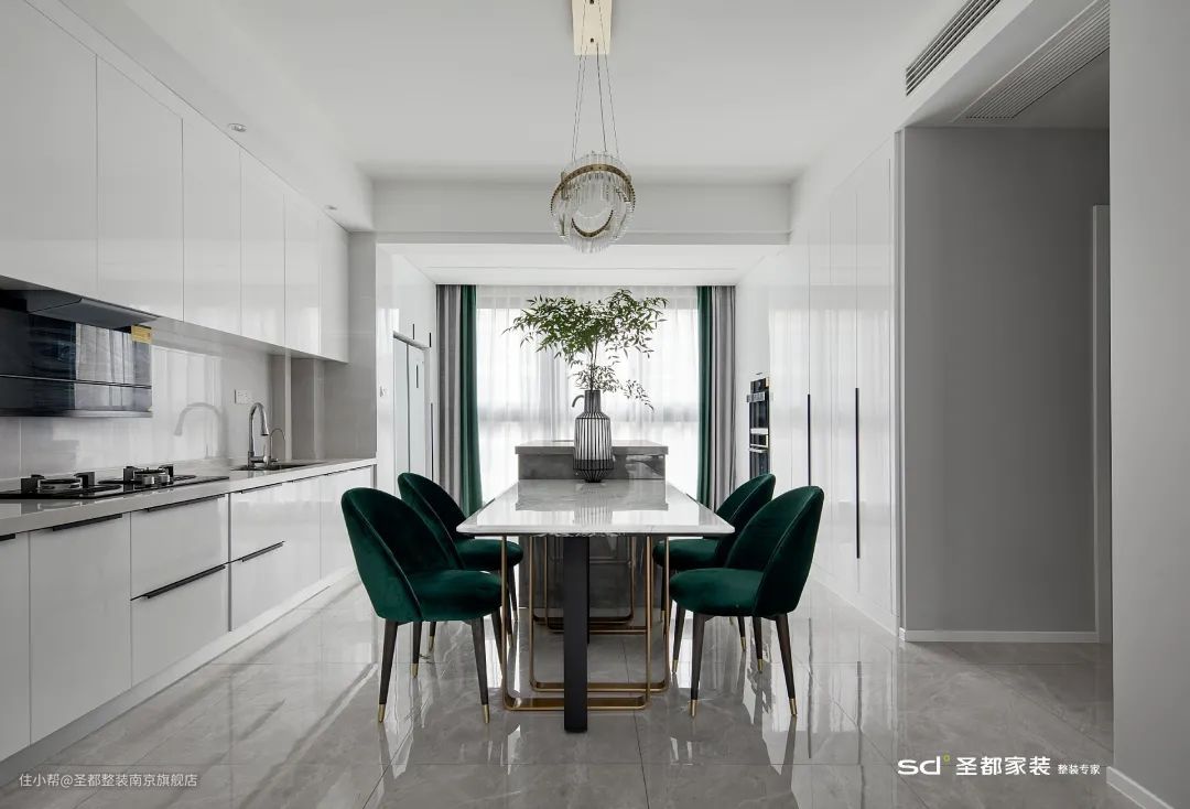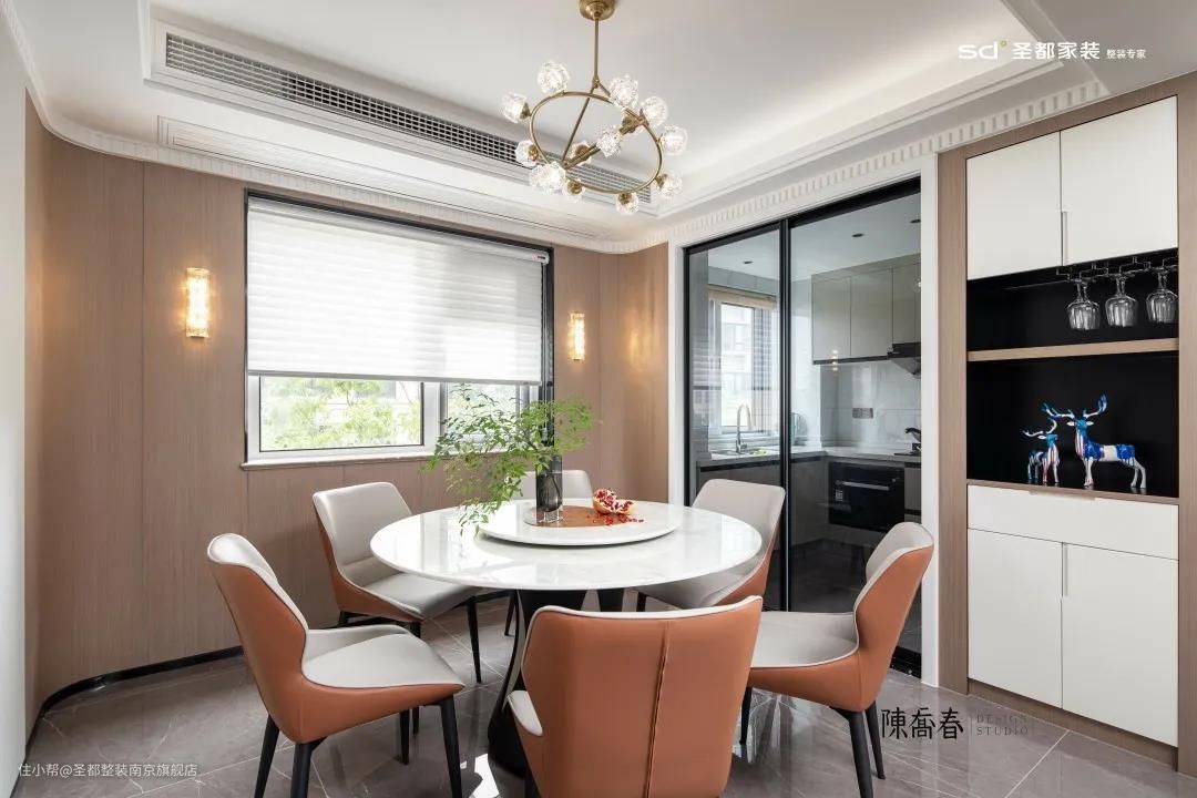 本案中,弧形阳台与厨房相连,直接将其设计成餐厅,一揽窗外无限风光,用餐的心情更美丽。