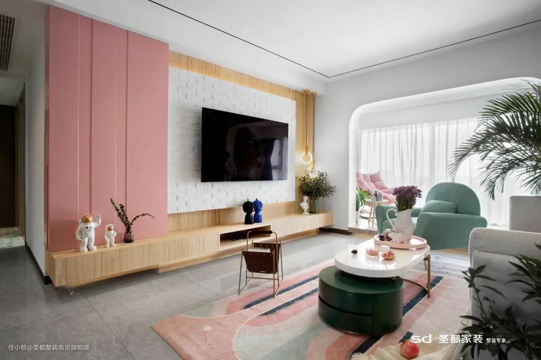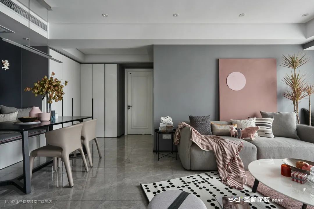 以弧形墙面作为转折,加上温柔细腻的茱萸粉,给人以满满的柔美质感,连带着入户光线也变得格外优雅。