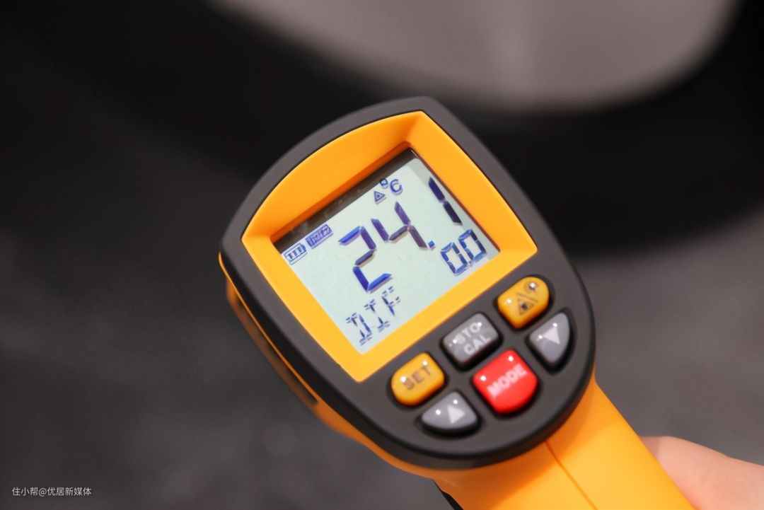 恒洁Q6智能一体机带有座圈加热功能,我们现场实际测试了一下:当天现场(2021年4月某一天的上海市)普通物体表面温度大约为24.1℃,恒洁Q6座圈加热实际测温为35.9℃,略低于人体体温,实际触感暖暖的,温度暖暖的刚刚好。