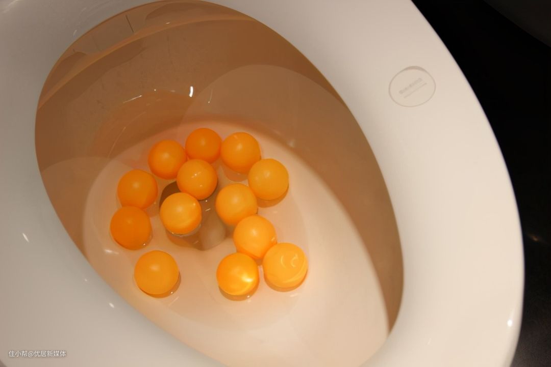 众所周知,漂浮在水面上的物体要比有一定重量的物体更难冲净。基于此,我们现场准备了若干个乒乓球,模拟日常生活中的块状物和漂浮物。通过视频我们可以看到,恒洁Q6智能一体机启动冲水后,全部乒乓球被迅速冲走,其超强冲力,名副其实!