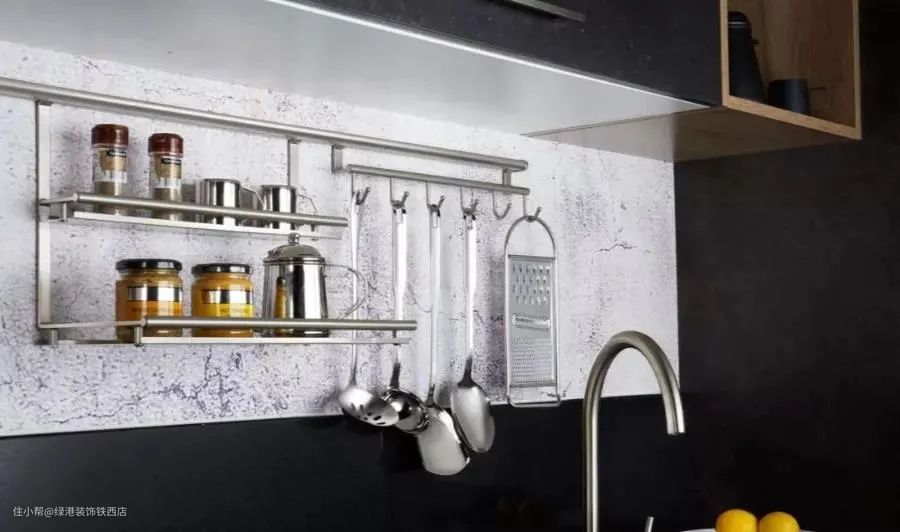 五金挂件功能性强且造型多,这类五金节省了台面空间,不仅可以挂锅勺、毛巾,还可以摆放调料瓶。