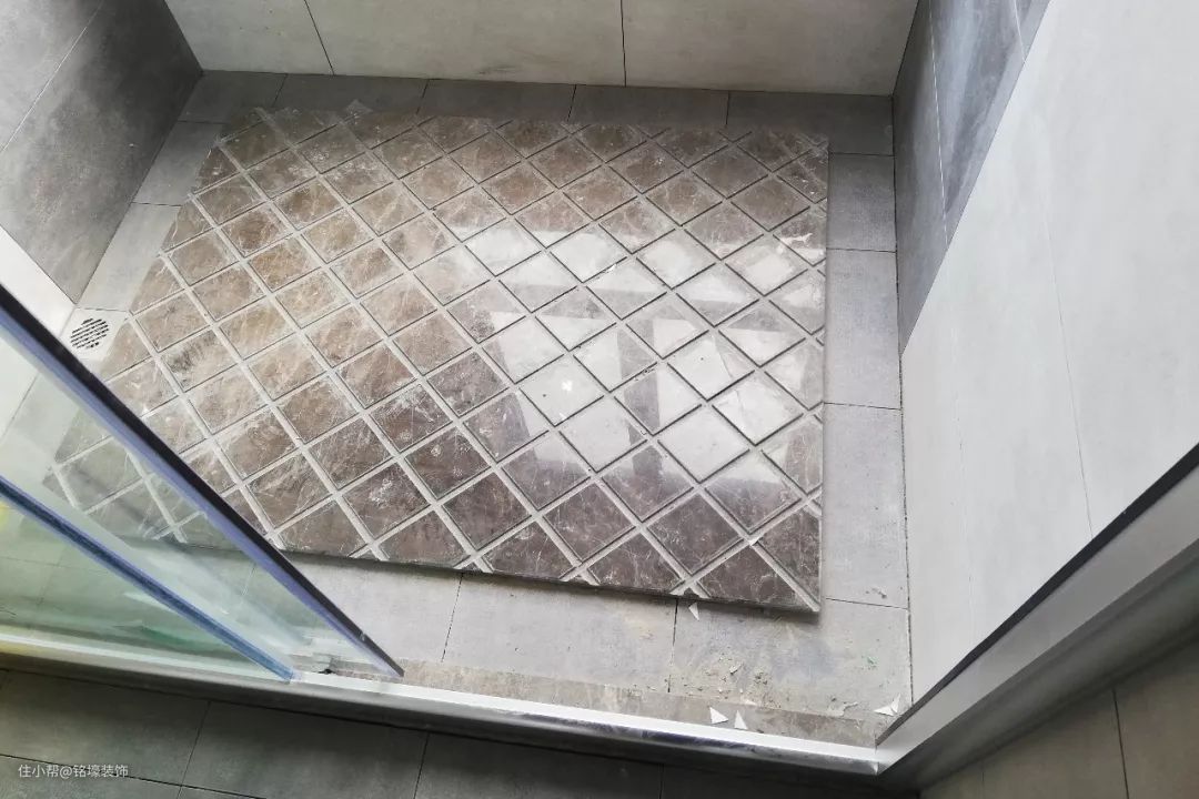 ▲ 对于一些异样地形空间的地砖铺设工作,很多时候会碰到切割问题。根据现场空间计算的瓷砖切割线,来进行铺贴。