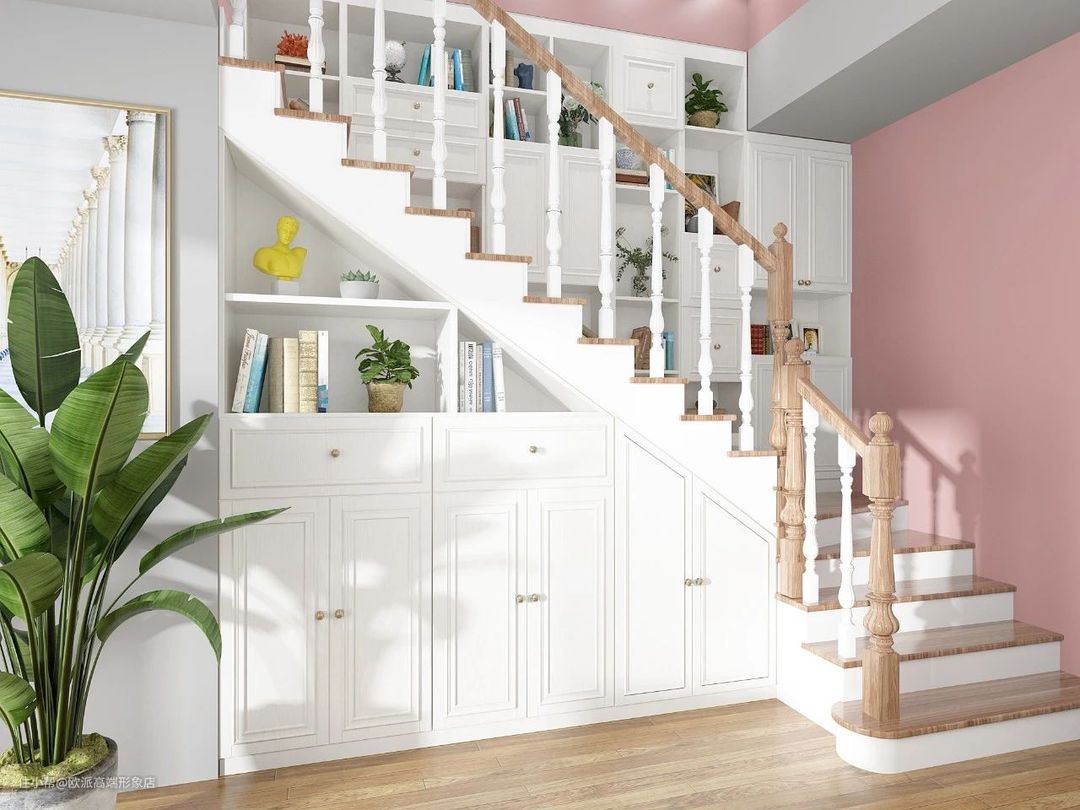 ▲复式的户型最常见的就是楼梯底空间容易被浪费,在此处做定制柜,让小空间发挥大作用,收纳周边大小物品超方便。