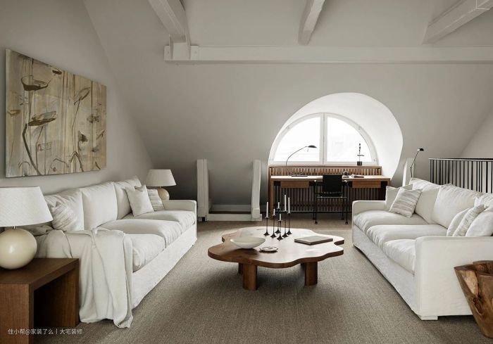 客厅被安排在了阁楼区域,整体的底色清新淡雅,将闲适的氛围展现的淋漓尽致,将空间唯美的气质镌刻入空间的每一个层次中。