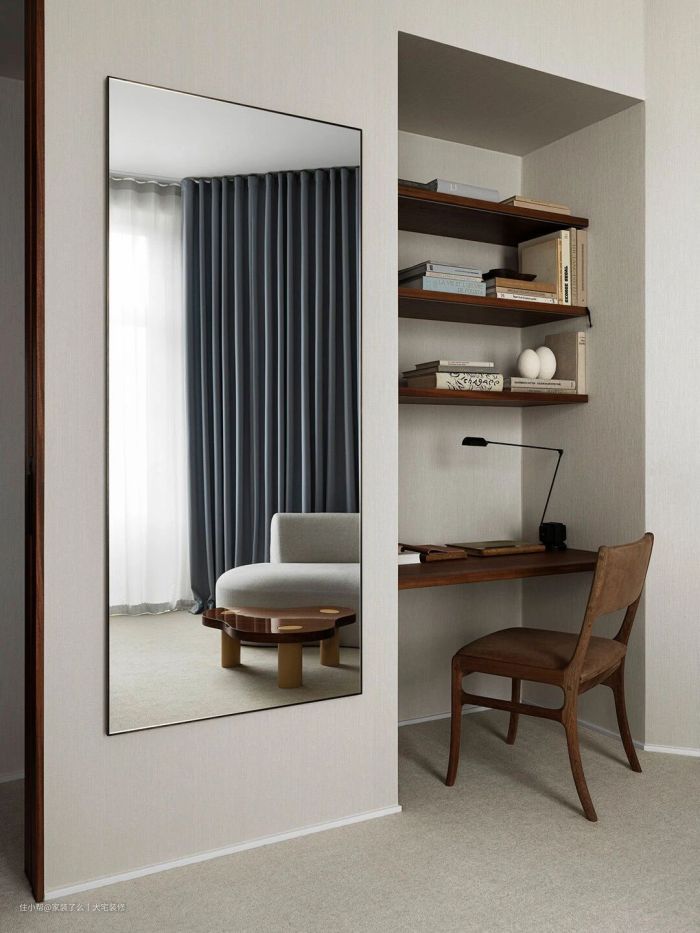 读书角与墙体夹角做一体化的设计,镜面设计让空间更显通透。