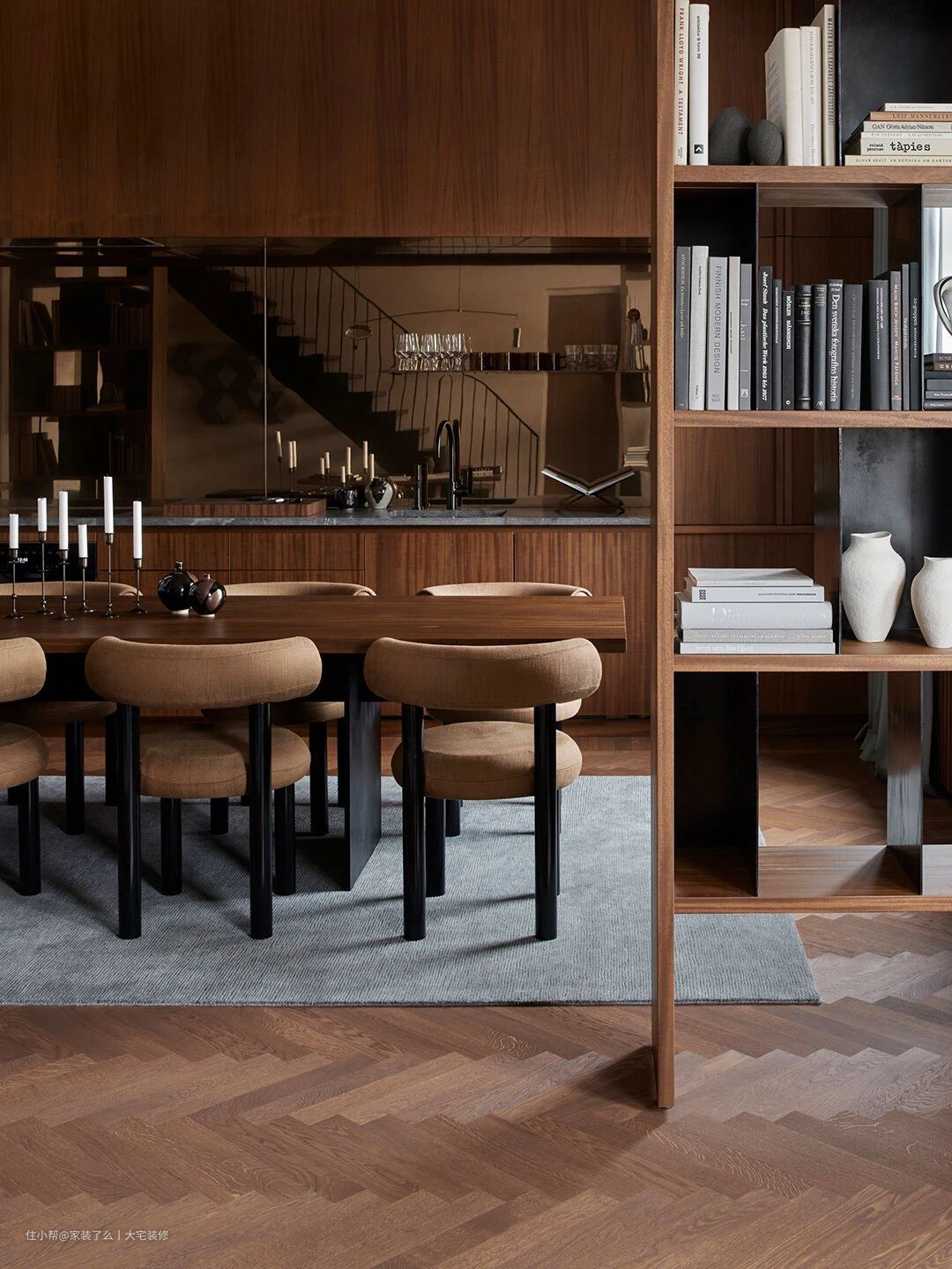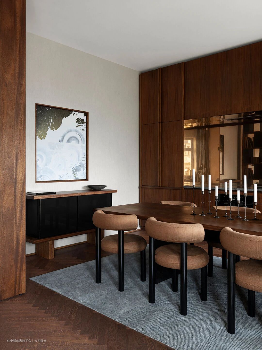 餐厅区域采用深色的木地板拼接,展现出空间典雅、稳重的气息,家居的设计往往还是需要依靠风格的承载,才能展现出本身的神韵。