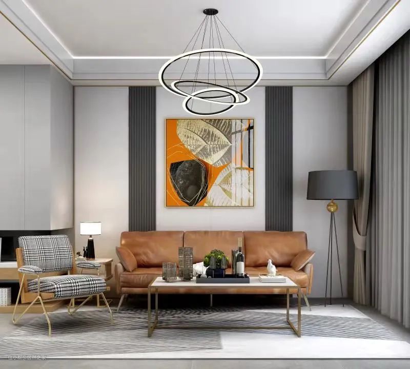 黄铜、皮质、玻璃樽...轻奢气质扑面而来。灰色平行木格栅中放置金属框艺术画将中间的空白部分填补,占据主视觉。只看一眼,也让人觉得这个家不简单~