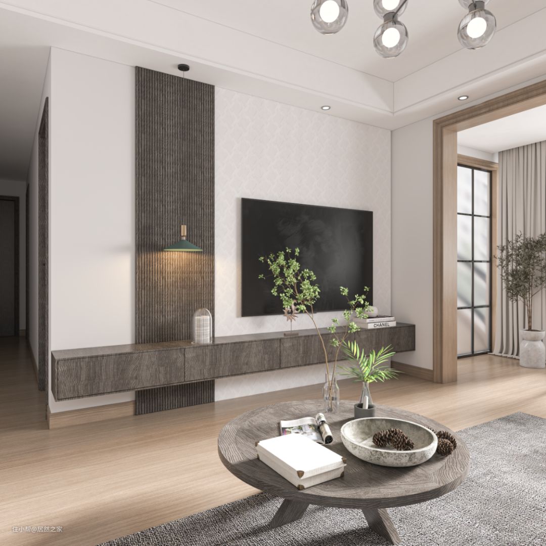 将木质悬空电视柜、小茶几与绿植和谐地融入到整个空间,更能烘托氛围。