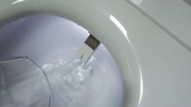 可以看到,附着在马桶内壁的蓝色洁厕剂瞬间被冲洗干净,完全没有残留 ▲