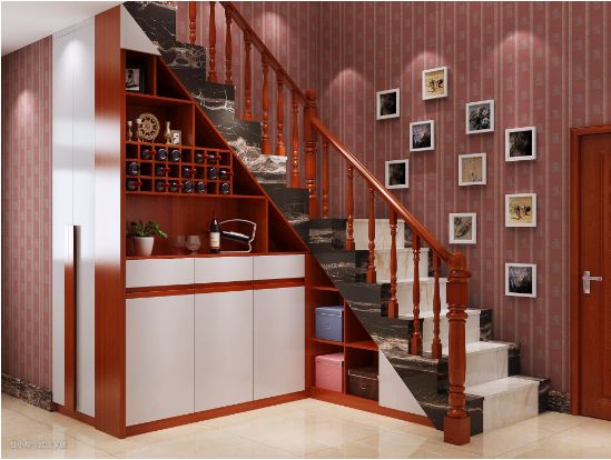 如果楼梯是在入户处的,那做成鞋柜+换鞋区是最好的选择;设置鞋柜、衣帽钩和鞋凳,可以轻松换鞋、挂衣。