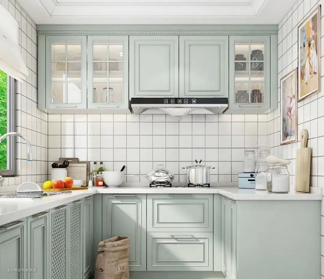 纯度低、明度高的冷色给人后退感,称之为后退色。在较小的厨房空间中使用后退色墙砖,能够让厨房空间显得更大。