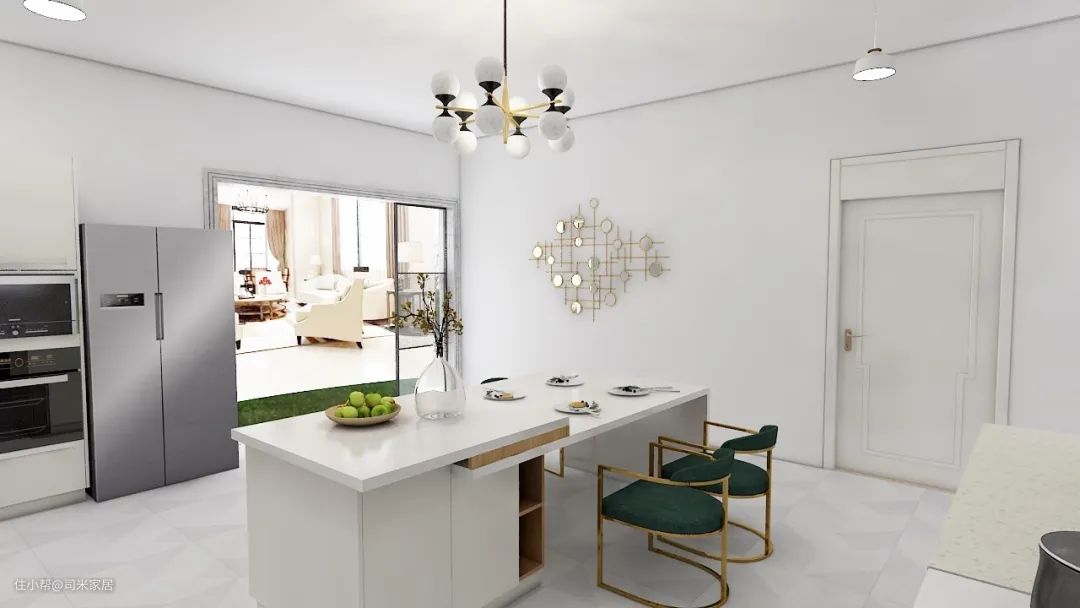 注意:在使用单色相进行色彩搭配时,可以通过明度、亮度进行对比搭配,厨具、餐具可选择黑白灰等无色彩设计,让空间更加和谐统一。