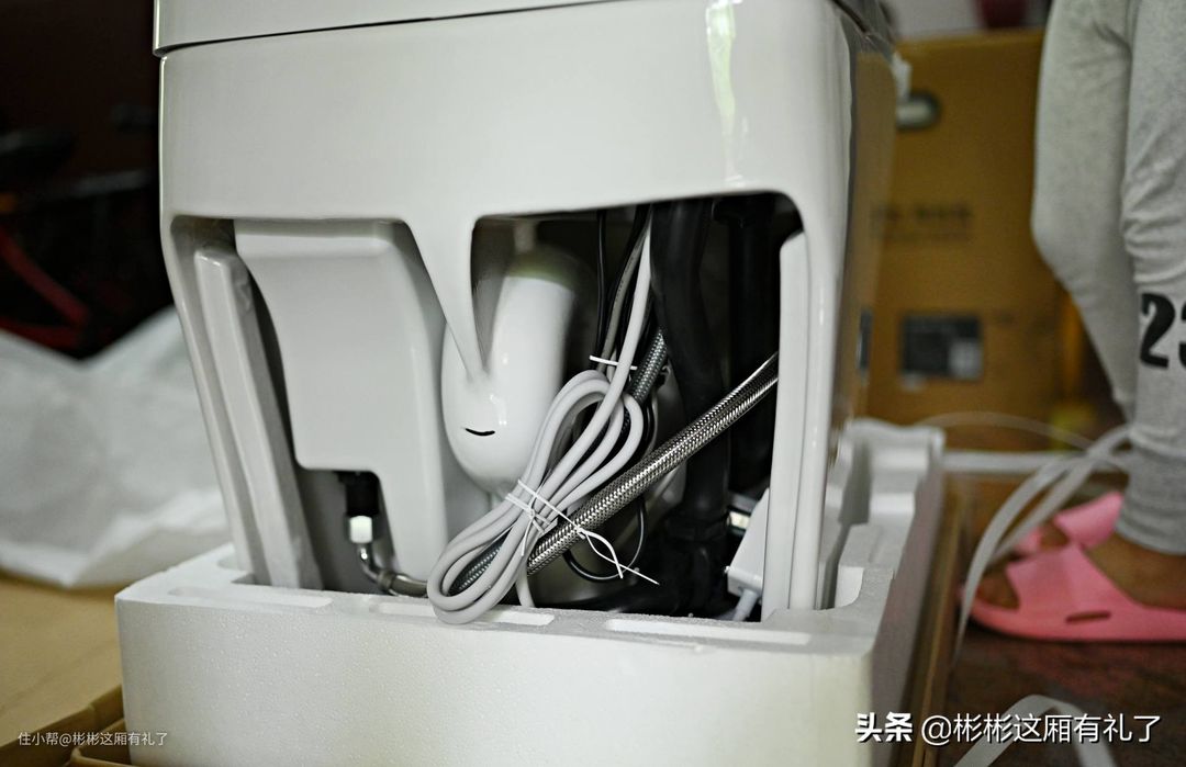 ▲简单地验了货,没有啥问题。可以看到马桶的背后并不是一根直线垂直下来的,靠近地面部分会有一个斜度,形成一个空间,给出水管腾出位置。不过这个空间并不是很大,除了孔径之外,左右的尺寸也要量好。配件倒是挺多的,而且藏的地方有点意思,有的放在马桶里边,有的在背后(管子出厂就接好了),也有的在箱子的泡沫板上。基本上,智米自带的五金配件挺齐全的,不用另外再购置。除非家里面的管道比较特殊,可能还需要再购置角阀。
