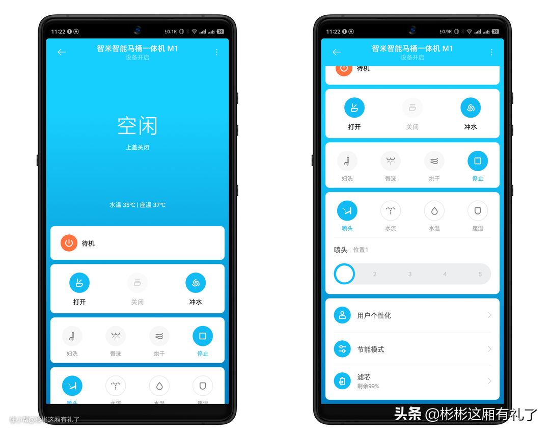 ▲整个操控界面的功能,其实跟遥控器上的差不多,就不再赘述。但会稍微丰富一点点,比如说可以进入节能模式、查看滤芯寿命等等。当然,如果在家的话,遥控器还是更为方便一些,拿上手就能用。但如果需要远程操作,比如要出远门之后才发现马桶忘了关机,那么就可以通过App来实现远程关机,可以避免无谓的耗电。