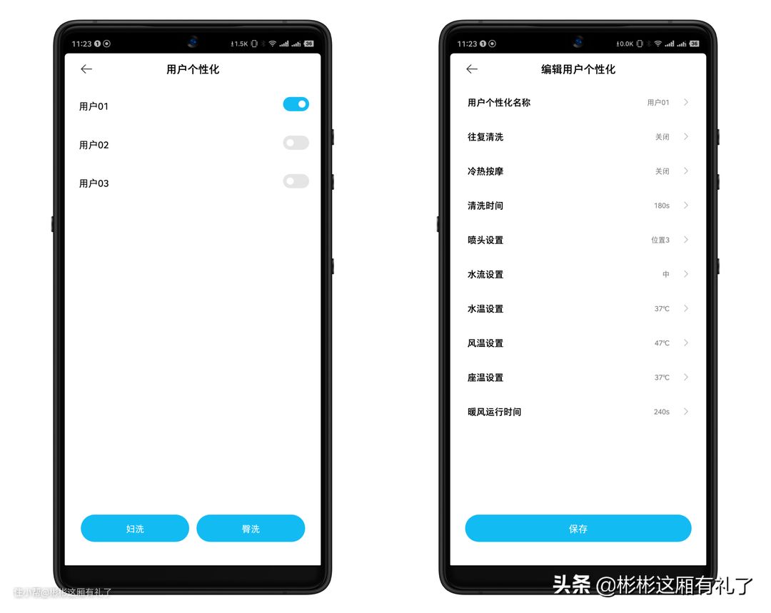 ▲在三个用户自定义方面,就需要手机App来进行详细的设置了(单用遥控器长按保存当前状态也可以,不过没那么直观)。比如说,家里边有爸爸妈妈女儿三个人,很明显,这是三个性别和喜好迥异的个体,那么在冲洗温度、频率、时长等等,都可以进行不同的设置,每次上洗手间的时候,可以进入自己最喜欢的模式,更贴合平时自己的如厕习惯。
