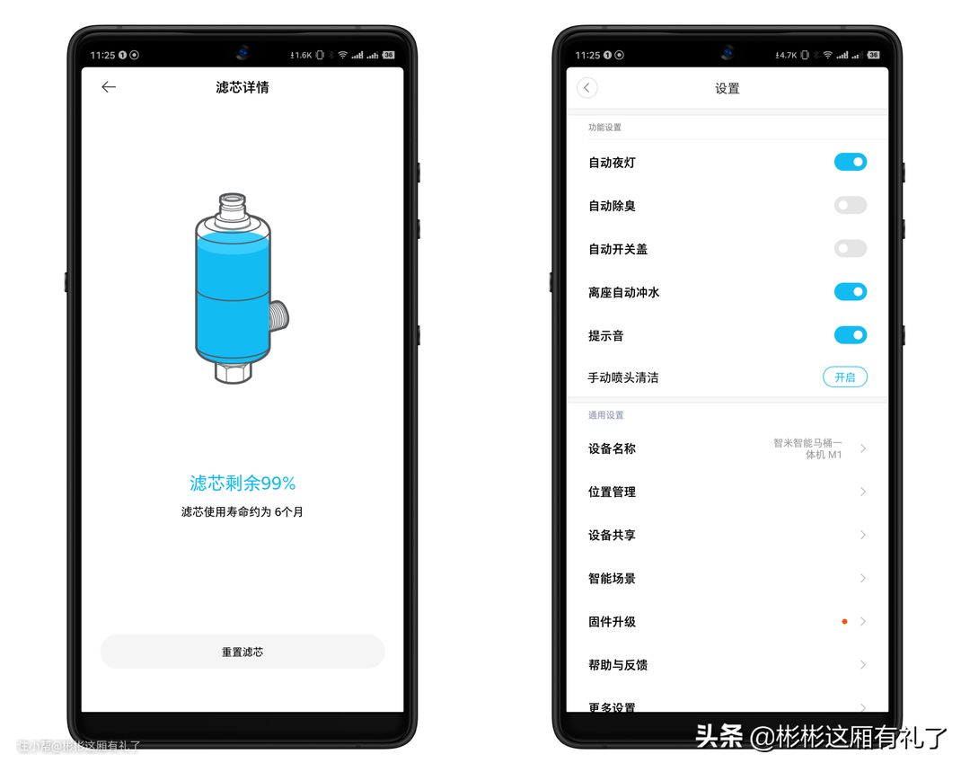 ▲App还可以进行更深入的设置,比如进行智能场景的设置(比如进家门自动开机、自动开盖、自动除臭,当然这个功能需要人体感应器联动),还有固件升级提示音等等,同时也可以查看滤芯的寿命。至于滤芯的作用,前面也提到了,可以对自来水进行净化,相比较而言会更加健康卫生一些。其中有一些设置非常细化且实用的,比如说马桶的夜间照明灯,可以单独设置关闭的时间段。