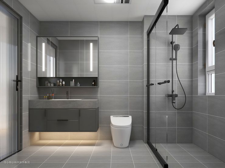 墙面选用灰色哑光质感瓷片,黑白灰的色系让卫生间整体感觉更高端起来,浴室柜下面的暖色氛围灯带为整个空间增添色彩。