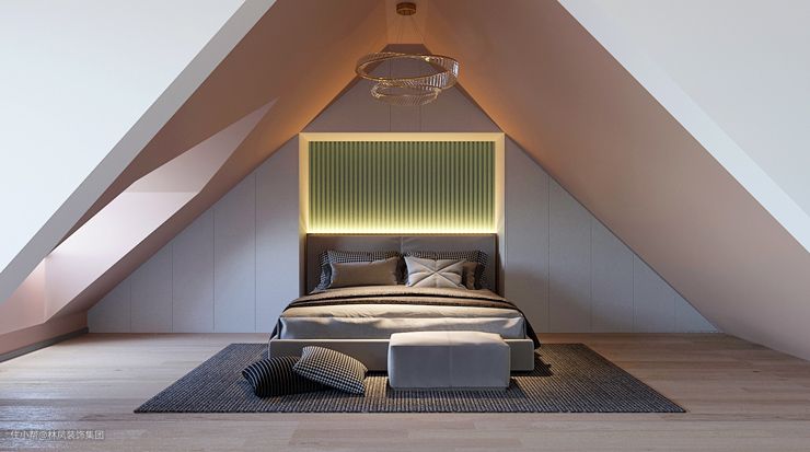 空间面积很大,由于是不规则尖顶造型,空间利用率不大,我们用一侧空间给男业主做了卧室,利用现有的造型特点。卧室整体刷漆,区域划分。床头均为木作格栅造型,长条的氛围灯使空间更温馨。