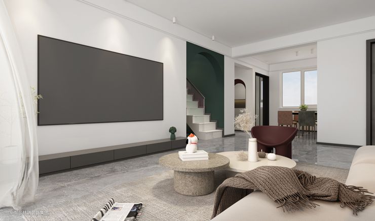 洞口弧形门洞和楼梯间满刷墨绿色,与沙发背景形成材料造型呼应。楼梯选用鱼肚白大理石,与墨绿色深浅对比。