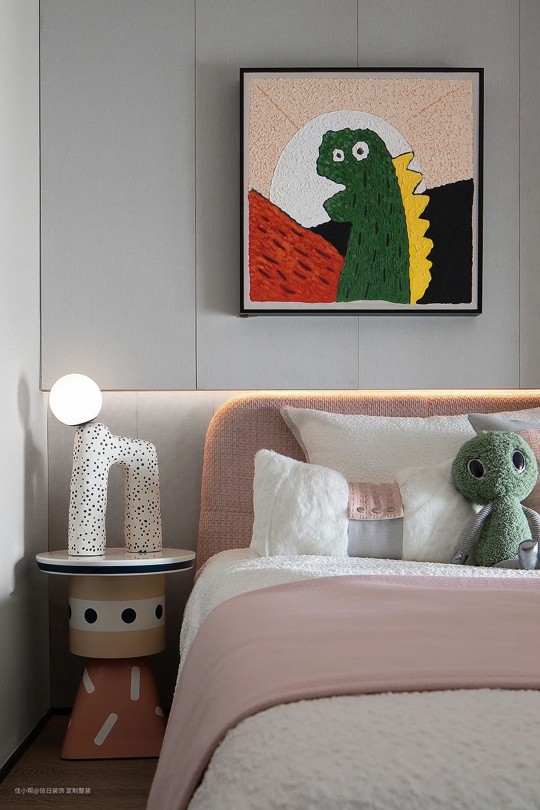儿童视角下的儿童房,空间的设计亮点集中在生动的卡通壁画上,以及造型独特的台灯和桌子,展示了儿童房的活泼风格和趣味性。