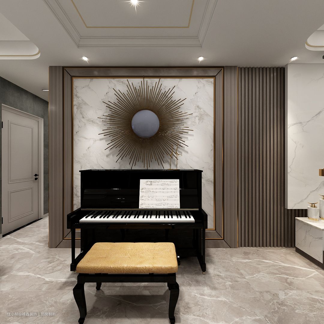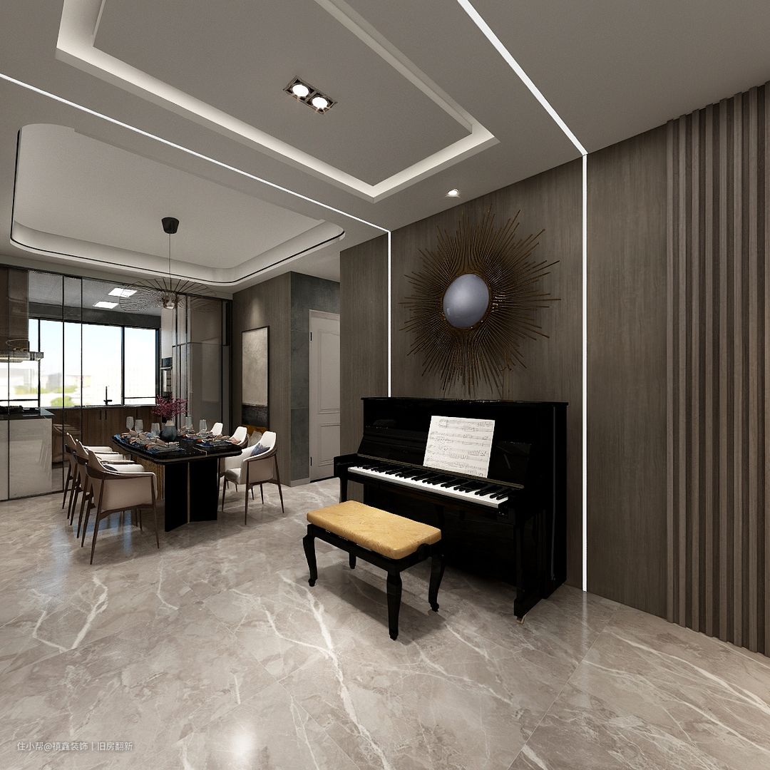 【客厅】为了将钢琴区域划分更加明显,在背景墙处设计两条平型灯带直接连通到吊顶处,光线灵动,现代感十足。