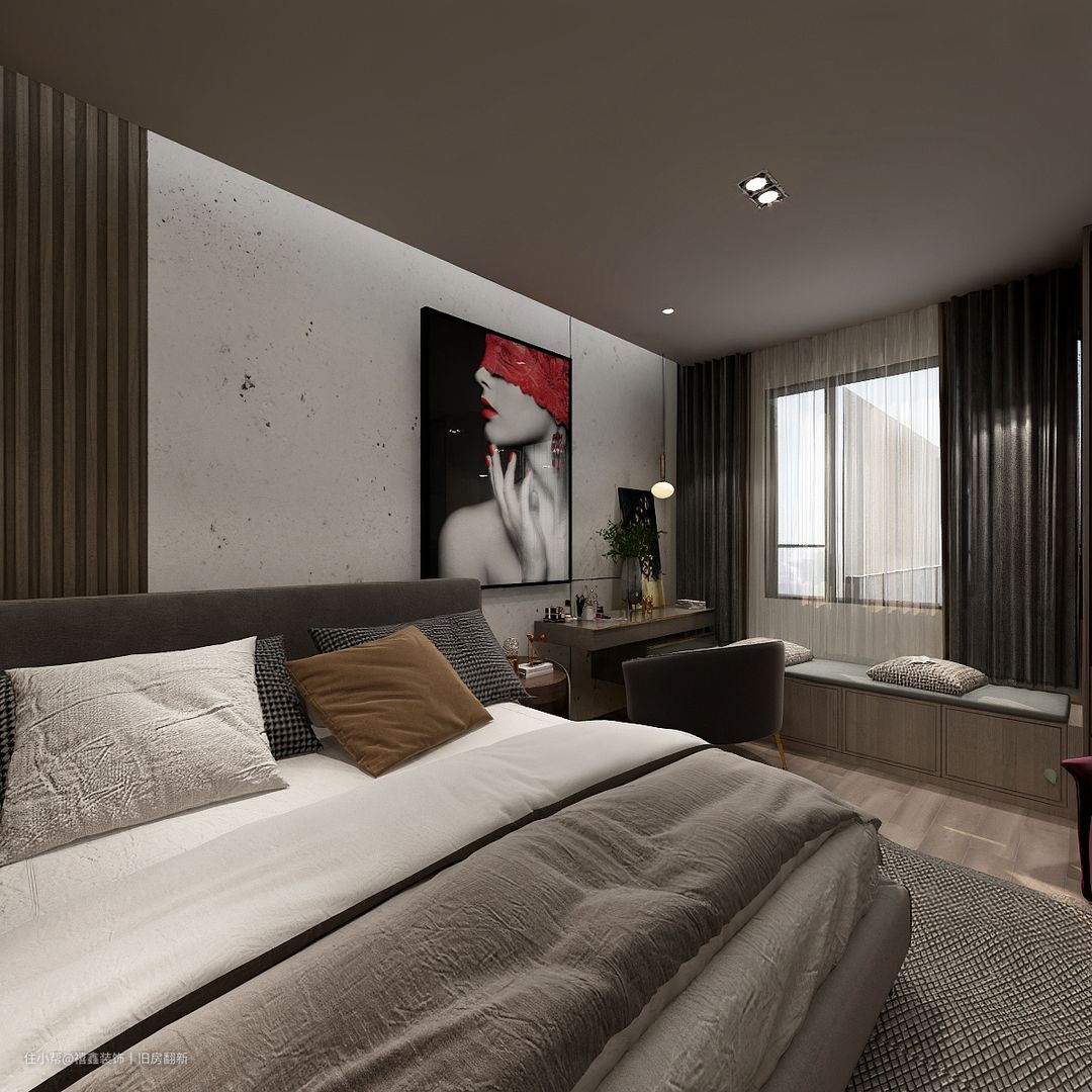 【卧室】卧室的墙壁设计了自然做旧的感觉,远处看起来像脏脏墙,但其实有着复古的时尚气息在内。搭配棕色格栅给人一种墙面层次感的效果,让空间充满了大气时尚。