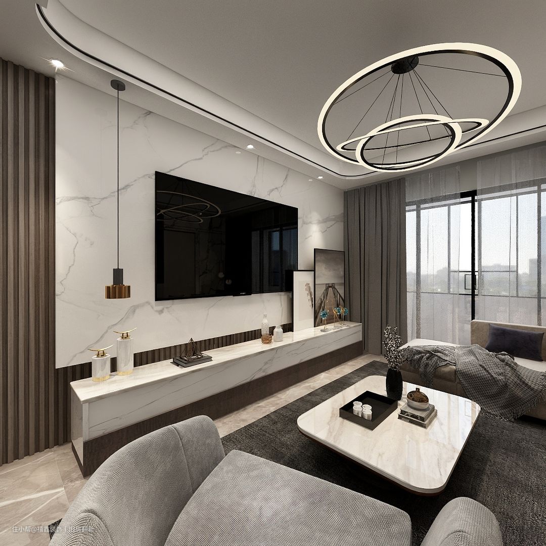 【客厅】大理石花纹岩板电视背景墙搭配格栅木质条纹,质感顶配精致优雅。简约的客厅通过不同元素的搭建和拼接,产生新的碰撞。